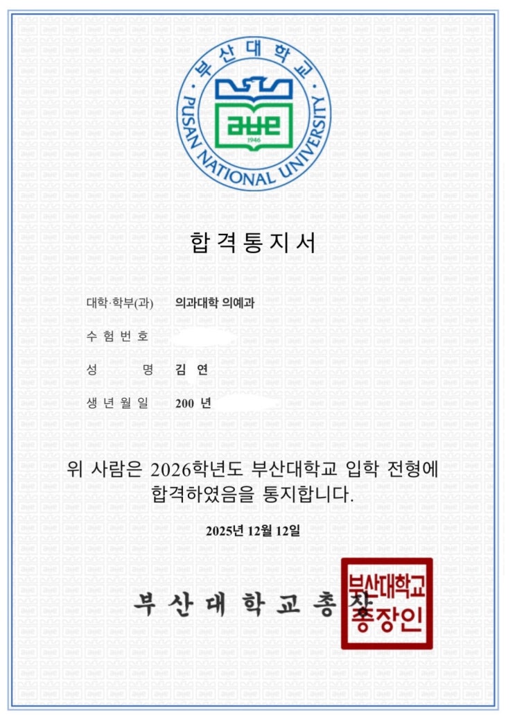 합격을 축하합니다. 올 한 해 정말 마음고생 많았습니다. 부산대 의과대학 의예과 지역인재 논술전형(수리논술) 합격 부산중앙여고 김O연 문의 010-8341-5505 부산논술 토마토학원(인스카이토마토학원) 부산 수영구 수영로 남천동 19-2 (수영로406) 대로변 새마을금고건물 3층 지하철 2호선 남천역 <img src="https://blogthumb.pstatic.net/MjAyNTEyMjRfNTgg/MDAxNzY2NTc2Mzc3Njc0.UkaIj14CP1XWXsjxcgxXuwBNBZdkZsT8mEA9cRRaskgg.eTbRdx-HMzKgyqOWnUMiOENleQgMQWm-Lx_5-P4T85og.JPEG/%BA%CE%B4%EB%C0%C7%BF%B9%B1%E8O%BF%AC.jpg?type=s3" />