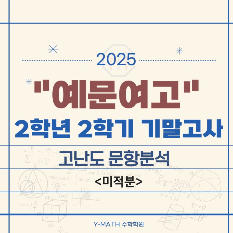 안녕하세요 와이매쓰 수학학원 입니다 이번 예문여고 2학년 미적분 기말시험은 학교 부교재인 N기출 기반으로 출제되었으며 일부 외부문항으로 수능특강, 모의고사 기출문제가 변형되어 나왔습니다. 대부분의 문제가 중간정도 수준의 난이도로 아주 고난도의 문제는 많이 출제되지 않았으나 이에 반면 쉬운 난이도의 문제도 거의 없어 학생들이 시험시간 내에 모든 문제를 풀기에 어려웠을 것으로 보입니다. 탄탄한 부교재 학습을 바탕으로 하여 변형문제에서 시간을 최대한 세이브하여 고난도 문제에 시간을 투자할 수 있도록 내신대비가 이뤄줘야 합니다. 그럼 지금부터 예문여고 미적기말고사 고난도 문항을 분석해 보도록 하겠습니다. ▶객관....... <img src="https://blogthumb.pstatic.net/MjAyNTEyMzFfMjkg/MDAxNzY3MTY3Mjk5MDY5.sekRrNHaZOqjRr5Qi3HvB9w5m8_G7CLK7PoOJOuR1NMg.wTNqBBXCXSyEOSZOk7KMMMCwcX5pYNaR891DNeiquFcg.JPEG/%BF%B9%B9%AE%BF%A9%B0%ED_2-2_%B9%CC%C0%FB%BA%D0.jpg?type=s3" />