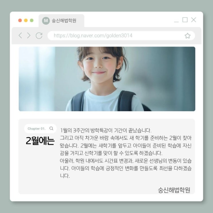 안녕하세요! 우리 아이들의 꿈을 함께 채워가는 숭신해법학원입니다. 유난히 춥던 1월이었지만, 3주간 진행된 방학 특강의 열기는 그 어느 때보다 뜨거웠습니다. 새로운 학기를 앞두고 누구보다 성실하게 공부한 우리 아이들의 소중한 결실을 공개합니다! 1월 학습 우수학생 시상 (치킨 쿠폰 증정! ) 노력한 만큼 얻는 성취감은 아이들에게 가장 큰 동기부여가 됩니다. 1월 한 달간 눈부신 성장을 보여준 우리 '공부 왕'들에게는 맛있는 치킨 쿠폰이 시상될 예정입니다! 1. 1월 월말평가 수학왕 (범위: 새 학기 1~3단원 A) 예습 과정임에도 불구하고 높은 집중력을 보여준 명단입니다. * 1등군: 양시호, 최윤서, 배재윤....... <img src="https://blogthumb.pstatic.net/MjAyNjAyMDZfMTc4/MDAxNzcwMzYzODY0MDkz.UFpkfQo9SdPqse2JkK9s696rM52Szs2O_LRHNlfhdx4g.jmxSBuU1t5OZFmunkyzg-QL20QPuPbxsT38ubTaYHKkg.JPEG/900%A3%DF1770363212934.jpg?type=s3" />