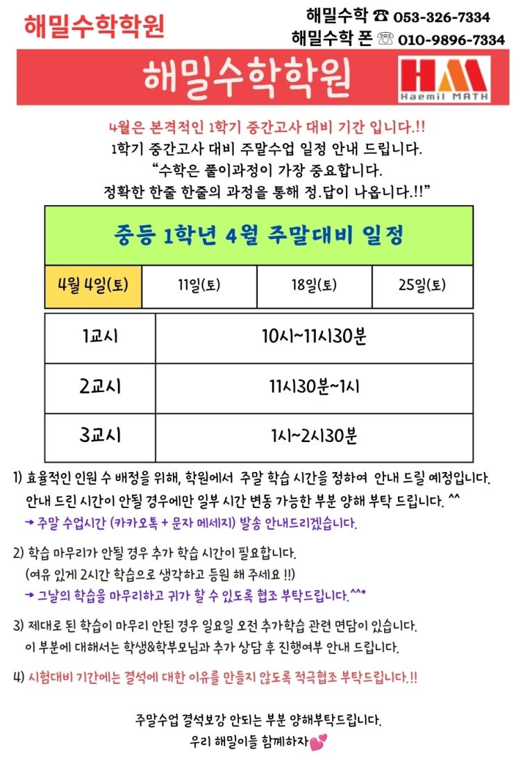 우리 해밀이들 4월달 달릴 준비 되었지요? ^^ 4월엔 타이트한 학습 관리가 진행됩니다. !! 해밀수학학원은 중등부 & 고등부 정규 수업 프로그램은 아래와 같습니다. 제가 상담 시 말씀 드리는 부분 중 하나는 "학원은 이용하기 나름 입니다." 이에요~ 정규수업은 무.조.건 기본으로 지켜야 하는 값이고~ 그 외 더 일찍와서 학습하기 or 더 남아서 학습하기 !! 이런 부분을 추가적으로 활용을 할 수 있는 여건이 되는데~ !! 그걸 이용하는 친구들도 있고~ 대부분은 정해진 수업만 하고 귀가하길 바라죠 ^^ 물론 어서 집에 가고 싶은 마음은 이해 됩니다. ^^;;; 호호호 하.지.만 !! 시험기간 한달동안만 !! 부족한 것은 마무리 하고....... <img src="https://blogthumb.pstatic.net/MjAyNjAzMjZfMjkz/MDAxNzc0NTA0NDYyOTkw.2aTjxA8jiiPm5m-hXQEkvExLawxD8rjAcN-3djPru18g.zZAv-bREAmauG0DjEX-hSXNdetrnZWtnuQKoK_4-8ukg.JPEG/1.jpg?type=s3" />