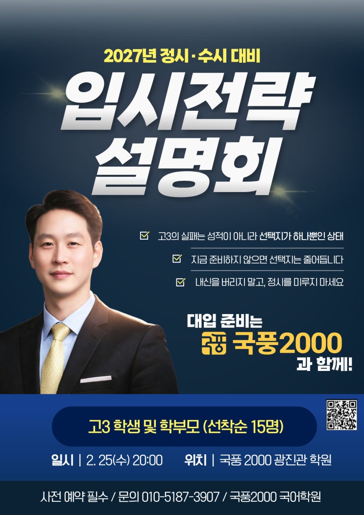 우리 아이 대입 전략, 제대로 잡고 계신가요? 끝까지 버티는 학생이 아니라, 전략 있는 학생이 합격합니다. 2027 대입은 ‘선택’이 아닌 ‘전략’입니다. 성적은 노력의 결과지만, 합격은 전략의 결과입니다. 국풍2000에서는 고3 학생 및 학부모를 대상으로 정시·수시 대비 입시 전략 설명회를 진행합니다. 2월 25일 수요일 오후 8시 국풍 2000 광진관(그레이스 빌딩 4층) 선착순 15명 전화 예약 필수 ( 010-5187-3907) <img src="https://blogthumb.pstatic.net/MjAyNjAyMTlfMTA3/MDAxNzcxNDcxOTIyODc0.oY-ZL02pRupHCkSi-HmWYv5oaNU_OYEKgwGtEQWK3c4g.ZbWU48ThSW3efzmDRU-VT9CG9Y9fX_-5btjPwY2xz4Ig.JPEG/%B0%ED3_%B0%A3%B4%E3%C8%B8.jpg?type=s3" />