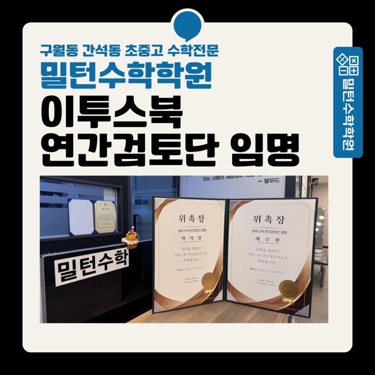 안녕하세요 간석동 구월동 초중고 수학전문학원 밀턴수학학원입니다! 오늘은 학부모님들께 정말 자랑스럽고 기쁜 소식을 전해드리려 합니다. 간석동 구월동 초중고 수학전문학원 밀턴수학학원 채수현원장님과 박지영선생님이 '이투스북 연간검토단’으로 공식 임명되셨습니다! 이투스북 연간검토단이란? 학생들이 사용하는 교재를 더 정확하고 깊이 있게 검토해 완성도를 높이는 역할을 하는 교육 전문가 그룹입니다. 쉽게 말해, “교재를 가장 잘 알고, 교육 현장을 가장 잘 이해하는 선생님들이 직접 참여하는 공식 검토팀” 이라고 생각하시면 됩니다!! ✨ 왜 이 위촉이 중요한가요? ✔ 교재의 질을 판단하고 개선 의견을 제시할 수....... <img src="https://blogthumb.pstatic.net/MjAyNTEyMDZfMjI4/MDAxNzY0OTk2NDc1NTMw.UVTj9227IhdFIHXX0X0a5UpKglWbeaTkp1TF369Xgn4g.-dAi5_H8dLksnrARmuYHmUpepzaH19rhEDIT3eASAGMg.JPEG/%C1%A6%B8%F1%C0%BB-%C0%D4%B7%C2%C7%D8%C1%D6%BC%BC%BF%E4_-001_%2870%29.jpg?type=s3" />