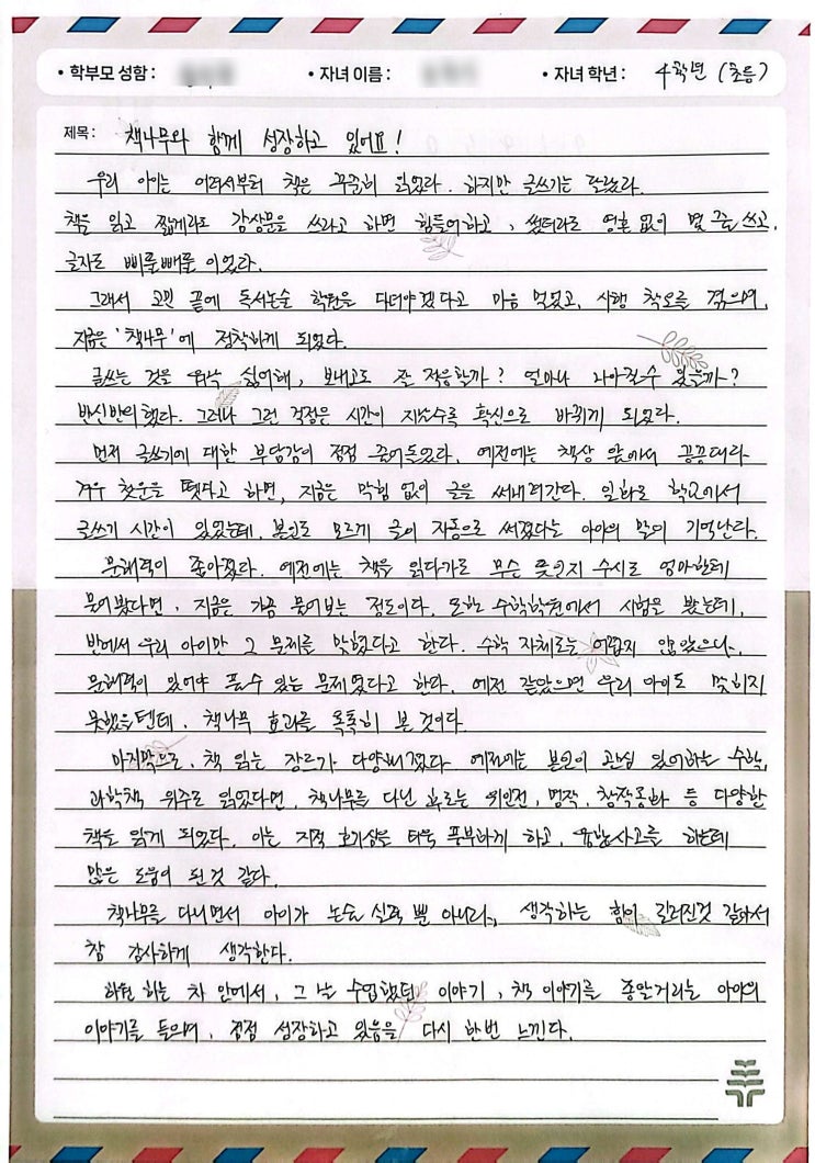 3개월 이상 책나무 부개점에 다니고 있는 아이들의 어머님께서 직접 아이들의 성장 이야기를 손글씨로 담아주셨습니다. 한 글자, 한 글자 저에게는 큰 무게와 깊은 울림으로 다가왔습니다. 사실 하고 싶은 말을 장문의 글로 표현한다는 것은 쉬운 일은 아니죠. 수학학원에서 시험을 봤는데... 수학 자체로는 어렵지 않았으나 문해력이 있어야 풀 수 있는 문제였다고 한다. 예전 같았으면 우리 아이도 맞히지 못했을텐데 책나무 효과를 톡톡히 본 것이다. 책 읽는 장르가 다양해졌다. 예전에는 본인이 관심 있어하는 수학, 과학책 위주로 읽었다면, 책나무를 다닌 후로는 위인전, 명작, 창작동화 등 다양한 책도 읽게 되었다. 지적 호기심을 더욱....... <img src="https://blogthumb.pstatic.net/MjAyNTExMjhfMTg3/MDAxNzY0MjU5OTUyMzM4.7ne3Vy8oNjeQknYUbUQN5ThfqoD9oygYGfudHUxUrU8g.fFA620VfIGLQ4bYkzN2P7bYcD7ZwZgD6Tnu012Ud_pAg.JPEG/CamScanner_2025._11._28._00.55_1.jpg?type=s3" />