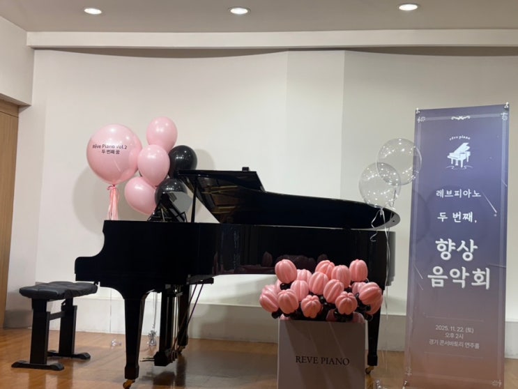 2025년 11월 22일 토요일, 레브피아노 두 번째 향상음악회를 reve piano vol.2 - 두 번째 꿈 진행했습니다 * . 9월에 악보를 처음 받아 들고, 기나긴 추석 연휴까지 성실히 지나온 우리 친구들! 서툴기도 하고, 때론 어려워하기도 했지만, 그 모든 시간을 견디고 지나 오늘 멋진 순간을 만들어 주었어요♥ 사실…우리 아이들이 곡을 못 외워서 불안해할까봐 그리고 보다 자신감 있게 연주할 수 있도록! 11월 첫째주까지 외워야한다고 은근슬쩍 이야기했는데,,,, (아주 좋은 방법이었어요 ❛˓◞˂̵) 아이들도 저도 정말 최선을 다해 준비한 향상 음악회✨ 이번 연주회가 아이들 모두에게 소중한 기억으로 남았으면 좋겠습니다 악기....... <img src="https://blogthumb.pstatic.net/MjAyNTEyMDlfMTM2/MDAxNzY1MjEzMjYyNjIx.QdhSOkdlmVomZRL-4xAiNNwMjKZ9k4XFfu8WZKOQI6Yg.gXNVX-PM3FTW7v6CfSWs94SiXYYkjBOaXdjhavGpyjEg.JPEG/IMG%A3%DF2964.JPG?type=s3" />