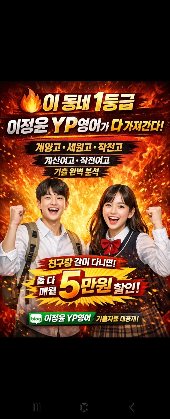 계양구에서 내신 영어 성적을 제대로 올리고 싶다면 수업 방식이 달라야 합니다. 이정윤 YP영어는 단순 문제풀이 학원이 아니라 학교 내신에 맞춘 수업으로 진행합니다. ✔ 학교별 시험 범위 분석 ✔ 서술형 대비 문장 훈련 ✔ 시험 직전 학교별 예상문제 풀이 특히 계수중 / 계산남중 / 계산여중 계양고 / 세원고 / 작전고 / 계산여고 / 작전여고 / 예일고 학교 내신에 맞춰 수업을 진행하기 때문에 단기간에도 점수 상승을 경험하는 학생들이 많습니다. 또한 학생들이 꾸준히 공부할 수 있도록 다음과 같은 할인 이벤트도 진행 중입니다. ✔ 친구와 함께 등록 시 ➡ 함께 다니는 기간 동안 두 학생 모두 매월 5만원 할인 ✔ 재수강 학생 ➡ 매....... <img src="https://blogthumb.pstatic.net/MjAyNjAzMTNfMjk4/MDAxNzczMzY2NzI0Mzk2.TzOTlM-JEmynDBStDb8-TE0M9in8_jVHgb5Tki7Tx9Qg.-CepraY7YJUDvy53_JlBrumHXjH1PWS1mqDVWtpxVbYg.JPEG/1773297226064.jpg?type=s3" />