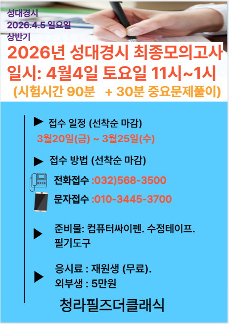 *4월4일 토요일 11시~1시 성대모의고사 접수를 시작 합니다. ** 접수는 학원전화. 문자. 각반 담임 선생님를 통해서 받습니다. *** 당일 시간 엄수. 준비물 지참 부탁드립니다. <img src="https://blogthumb.pstatic.net/MjAyNjAzMTdfMjQ5/MDAxNzczNzQ1Njk1MjIx.4Z2RZA263Jh-cyFRaYE5cgwzGwZ6XG8ElSyUgLoeMSMg.LRaOcjk0t-U86BB8QsJiLfpLdfh6NDBQ4lzhZSu1elAg.PNG/KakaoTalk_20260317_195752023.png?type=s3" />