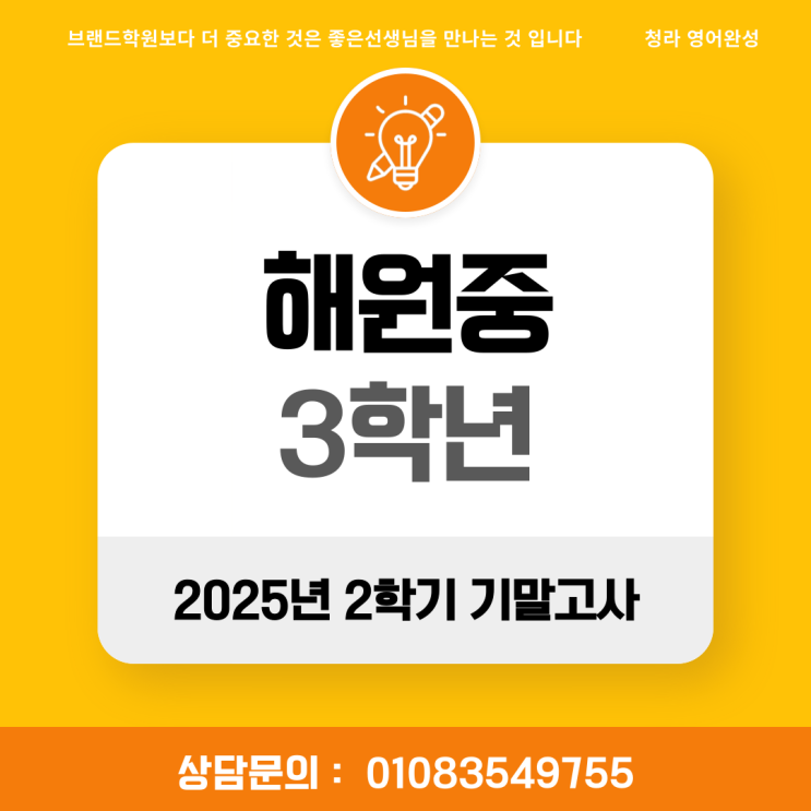 청라 5단지 중고등 입시&내신 영어학원 영어완성 입니다 !!!드디어!!드디어!!! 중3 학생들의 모든 중학교 교과과정이 끝났습니다! 중학교를 보내는 지난 3년동안 학생&학부모님들 모두모두 정말 고생 많으셨습니다! 그렇다면 이번 마지막 시험 잘 마무리 하셨나요? 청라지역 중학교는 '고입 원서 작성' 의 이유로 2학기에 시험이 한 번 밖에 없습니다 때문에 그만큼 시험 범위도 많고 준비 기간도 길어지면서 전 과목을 꼼꼼하게 챙기기 쉽지 않을지도 모릅니다 영어는 어땠을까요? 해원중3 영어시험 바로 분석해 보겠습니다! 해원중3 영어 시험 범위 교과서(동아윤) 5,6,7과 + 추가 지문 이번 시험은 올해 치른 3번의 시험 중....... <img src="https://blogthumb.pstatic.net/MjAyNTExMTFfMjg3/MDAxNzYyNzg3NDU1OTQ5.77qVV7w_dwd8dn0M3BnAa7SWq9QQhChqYhYfKDiHQH4g.GhwO08qMe7NsTZatiyCjjGhx6Z1OpNP_ntzBqOnbjZAg.PNG/%C1%A6%B8%F1%C0%BB-%C0%D4%B7%C2%C7%D8%C1%D6%BC%BC%BF%E4_-001.png?type=s3" />