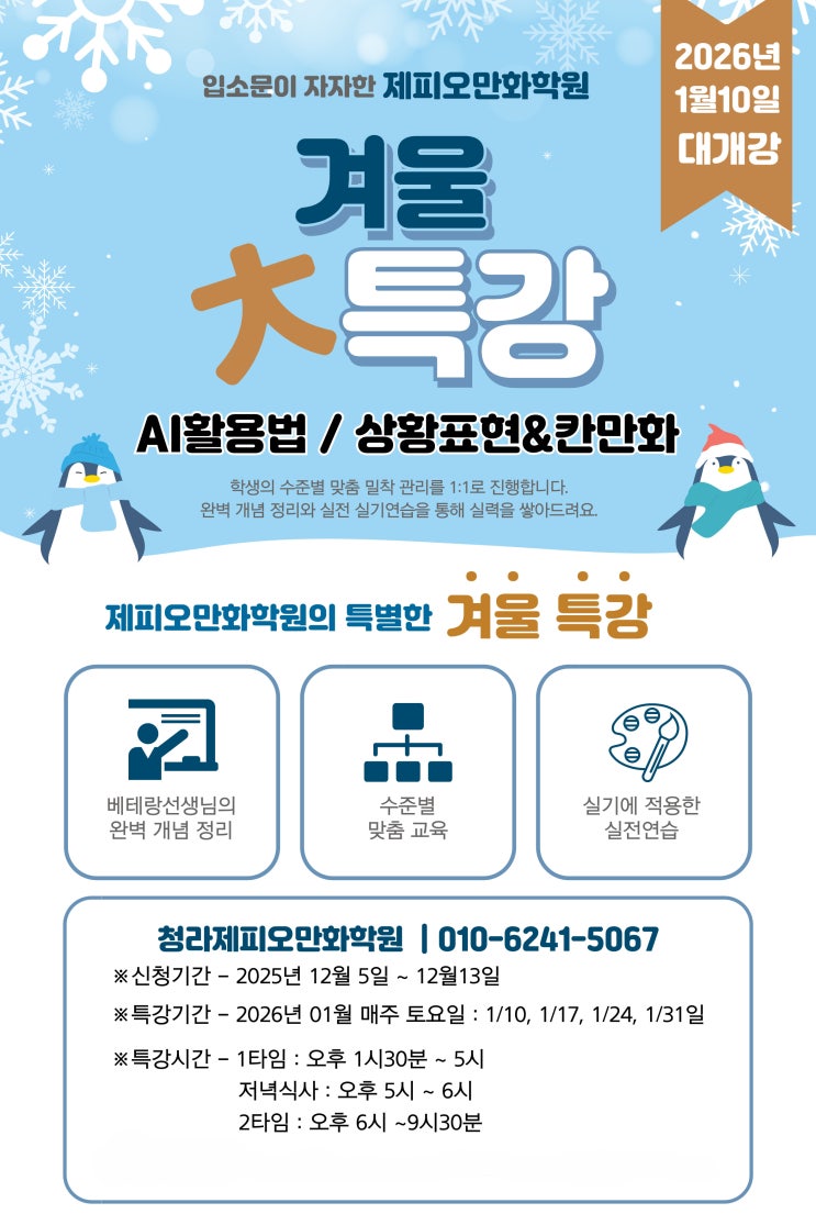 안녕하세요! 드디어 첫눈이 내렸네요~ 바람도 많이 쌀쌀해져 감기 조심하시길 바랍니다! 오늘은 저희 제피오 만화학원에서 진행하는 겨울방학 특강을 알려드리고자 합니다! 포트폴리오나 입시 준비하는 학생분들에겐 너무나 유익한 수업이 될 거라 생각합니다! 수업이 궁금하신 분들은 제피오만화학원으로~!! TEL. 032 - 561 - 5067 [청라점] '제피오 만화학원'은 미래를 준비하는 '작가들의 작업공간' 입니다. #만화학원 #인천서구만화학원 #인천만화학원 #미술학원 #인천미술학원 #인천서구미술학원 #제피오만화학원 #청라제피오만화학원 #초등학생만화학원 #중학생만화학원 #고등학생만화학원 #만화 #일러스트 #칸만화 #상....... <img src="https://blogthumb.pstatic.net/MjAyNTEyMDZfMTM2/MDAxNzY1MDA3OTYzMDIz.-YSgiHNydtWlBTTTxauHhUBHCsbb9QdnLuC7mBlSy44g.Khh_qmdm49pj16zxaOkvyUBxafL5Y2p3Js8nqVGm4k0g.JPEG/2025_%B0%DC%BF%EF%B9%E6%C7%D0_%C6%AF%B0%AD_%B0%F8%B9%AE.jpg?type=s3" />