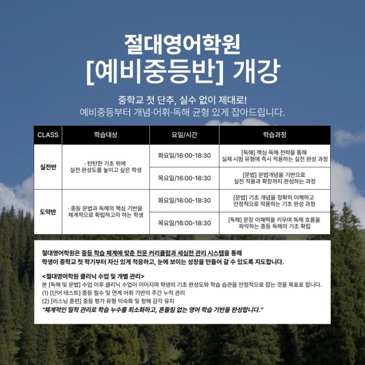 절대영어학원 [예비중등반] 개강 안내 중학교 첫 단추, 실수 없이 제대로 준비해야 합니다. 예비중등부터 개념·어휘·독해의 균형을 잡아두는 것이 곧 중등 3년, 나아가 고등 영어 실력의 차이를 만듭니다. 절대영어학원은 단순히 선행만 하는 것이 아니라, 중등 과정에서 실제로 필요하고 ‘성적 향상으로 이어지는 기반’ 을 단계별로 만들어가는 구조화된 수업을 제공합니다. [개설 반 안내] 실전반 & 도약반 [실전반] 탄탄한 기초 위에 실전 완성도를 높이고 싶은 학생 • 화/목 16:00~18:30 • 독해 핵심 전략·문법 개념 기반 적용 • 실제 시험 유형에 즉시 반영되는 실전 완성 과정 [도약반] 중등 문법·독해의 핵심 기반을 체계적으로....... <img src="https://blogthumb.pstatic.net/MjAyNTEyMDFfODQg/MDAxNzY0NTQzMTM3NTY2.Bs4_Ua3JwiFrIRjqJsZ4kQ9cpndVFzjDZ8w8AqxugXsg.1Vsf_2OSq_F-H-VwZBnUhsK5AoE-NXzSn2Dl_gf0YKkg.JPEG/IMG%A3%DF7017.JPG?type=s3" />