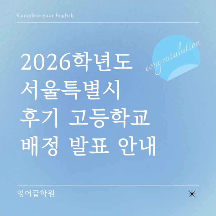 #서울시고등학교배정발표 #서울시일반고배정발표 #동대부고 #해성여고 #휘경여고 #동대부고영어학원 #해성여고영어학원 #휘경여고영어학원 #장안동영어학원 #장안동고등내신전문 #영어끝학원 안녕하세요 영어끝학원입니다 지난 12/3~12/5 에 서울특별시 후기고등학교 원서접수가 시행되었습니다 우리 예비고1 학생들이 오랜 고민의 시기를 거쳐 결정한 2026 서울특별시 후기고등학교(서울시 일반고 213개교) 발표일은 언제일까요! 서울특별시 후기고등학교 배정발표일은 2026년 1월 29일 목요일입니다 배정학교 확인은 출신 중학교와(배정통지서 수령) 출신 중학교의 교육지원청, 또는 하이인포 홈페이지에서 하실 수 있습니다. ▽ 배정확인(26년....... <img src="https://blogthumb.pstatic.net/MjAyNTEyMDdfMjcx/MDAxNzY1MDM1OTkzMzgx.F767RhiEZcSLjIjsFlgf2txwuBpsnfeban4ytDeFE8wg.O5OljbKKop3cUPWHFXRQnw6FlA320CkM9IbY13cWHzYg.PNG/%C1%A6%B8%F1%C0%BB_%C0%D4%B7%C2%C7%D8%C1%D6%BC%BC%BF%E4..png?type=s3" />