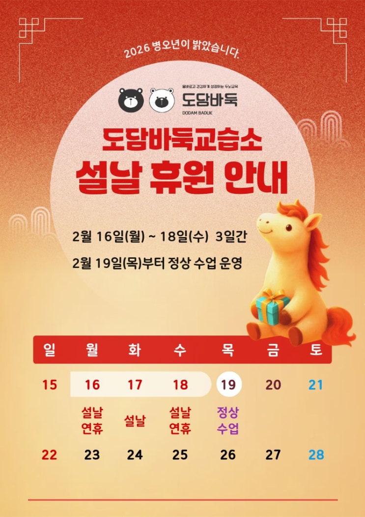 안녕하세요~ 도담 바둑 교습소입니다. 2/16일(월) ~ 2/18일(수)까지 3일간 2/19일(목)부터 정상 수업 운영 설 명절을 맞이하여 교습소 휴원을 하려 합니다. 휴일 포함하여 모처럼 긴 연휴입니다. 아이들과 즐거운 시간 보내시기바랍니다.^^ 상담 및 문의 010-3926-6201 <img src="https://blogthumb.pstatic.net/MjAyNjAyMTRfMTMw/MDAxNzcxMDU0NjI5MTkx.QibvHM2StIR1WUSr2poCs7NjHNGLT3DHjLyWU2-rWs4g.jWmtOjU8-Swlpt6FWaLqWsssYucJedHTuqdFqRaSJpQg.JPEG/KakaoTalk_20260214_163305990.jpg?type=s3" />