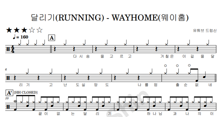 안녕하세요^^ 광주 최고의 시설 & 실용음악 전문학원 "블루실용음악학원" 입니다. "5"만 유튜버 "드럼신"원장님이 언제나 최고의 드럼실력으로 여러분과 함께 합니다 오늘 올려드릴 영상과 악보는 ' 웨이홈 ' 의 "달리기 " 입니다 체계적인 노하우로 드럼 연주에 도움이 될 수있게 직접 정성껏 만들었습니다 드럼반주자 분들께 많은 도움이 되시기를 바랍니당^^ 즐겁게 감상해주셔요^^ 악보 구매 사이트 드럼 & 악기 & 보컬 레슨문의 네이버 톡톡 : 블루실용음악학원 카카오톡 : 블루실용음악학원 인스타그램 : @bluemusic_academy 디엠은 언제나 환영해요^^ 감사합니당^^ <img src="https://blogthumb.pstatic.net/MjAyNjAyMjBfNDcg/MDAxNzcxNTcwODk1OTgz.0SP_ZNfr95xraKi3KbMFJqsyHNaWWlaekxAynrLFAA4g.d017FDnehO5kqlS3gOPO8LNs0iXHNZJKpllfGMQ6wWkg.PNG/%B4%DE%B8%AE%B1%E2_%BA%ED%B7%CE%B1%D7.png?type=s3" />
