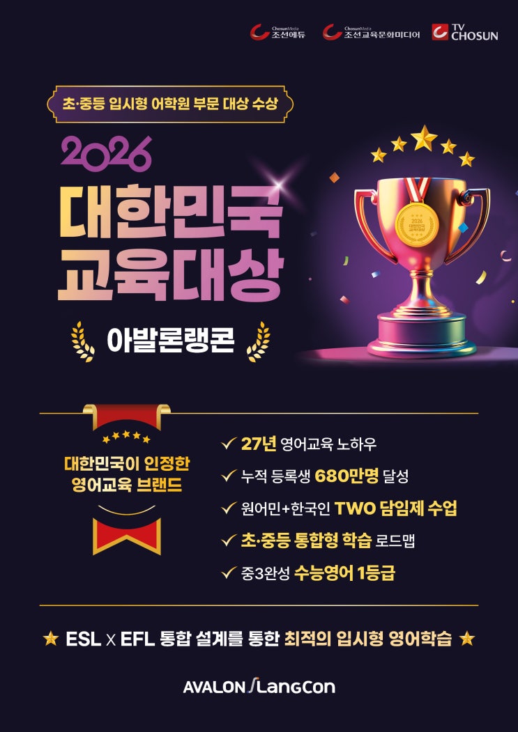 안녕하세요 수완동 영어학원 아발론교육입니다~! 오늘 도착한 황금빛 명패입니다! 바로 대한민국 교육대상!!!!!!!!!!!!!! 조선에듀에서 대상으로 선정한 아발론! 초중등 입시시험 어학원을 찾고 계신다면 아발론입니다. 2026 대한민국 교육대상 수상~!!! 아발론이 초·중등 입시형 어학원 부문에서 대상을 수상했습니다. 대한민국이 인정한 영어교육 브랜드로서, 27년간 쌓아온 노하우와 체계적인 학습 시스템을 바탕으로 운영되고 있습니다. 아발론랭콘의 특징 27년 영어교육 노하우 누적 등록생 680만 명 달성 원어민 + 한국인 TWO 담임제 수업 초·중등 통합형 학습 로드맵 제공 중3 완성 수능영어 1등급 목표 ✏️ 최적의 입시형 영어학습....... <img src="https://blogthumb.pstatic.net/MjAyNjA0MDNfMjEg/MDAxNzc1MjA1MDQ4NDM3.zwKZppMA5nPXedrhqxpi2YD_KDKXaADXa41tNXnMfUwg.rfr-Rn7G6mvSBufXAFo6EW4z0fnoiwepkz9xV77Msf0g.JPEG/2026%BA%BD%C7%D0%B1%E2_%C6%F7%BD%BA%C5%CD_2026%B1%B3%C0%B0%B4%EB%BB%F3_A3.jpg?type=s3" />
