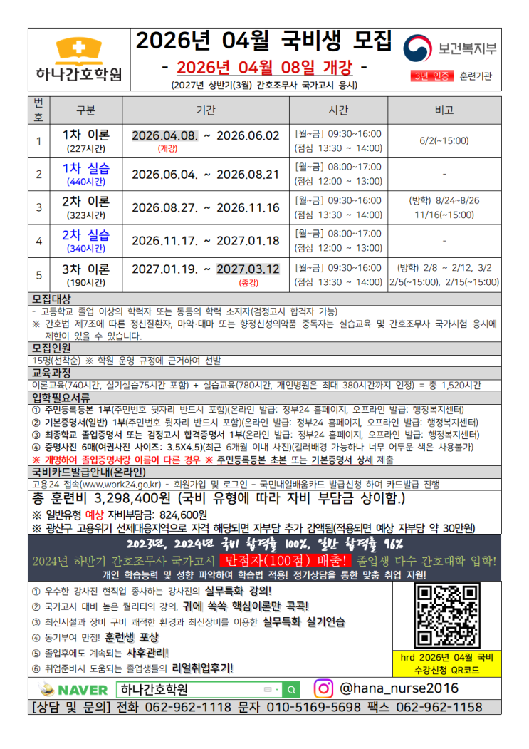 여러분 하나간호학원에서 좋은소식 끼려왔어요~~ 광산구 고용위기 지역으로 선정되어 기간이 연장되었답니다. 위에 해당되시는분들은 자비부담금 대폭 완화 입니다. 2026년 상반기 간호조무사 자격 취득과정 개강일정 상반기 첫번째 개강입니다!! 2026년 04월 08일 개강입니다. 2027년 03월 12일 종강입니다. 총 222일 과정입니다! 하나간호학원의 우수한 취업률!! 72.7% 훈련과정 간호조무사 자격 취득과정 (감염관리 06020403) 훈련기간 2026년 04월 08일 ~ 2027년 03월 12일 (1,520시간, 222일) 훈련비 3,298,400원 (2023년 3,179,840) 자비부담금은 (유형에 따라) 달라질 수 있습니다. 2024년부터 직업훈련검색 사이트가 고용24로 변경되었습....... <img src="https://blogthumb.pstatic.net/MjAyNjAzMjBfMjY2/MDAxNzczOTcyNTM0NTkx.P7D0NLE9beo9l8BuzOqezVjosLKjGNuH_IJU0xw2HqAg.Ed0LgY8NqKLQ_B2FGzPRe4qge_hGh-HyM3oz79Dq9Bkg.PNG/2025%BD%C5%BC%AD%BD%C4-%B0%A3%C8%A3%B9%FD_%B8%ED%C4%AA_%C0%FB%BF%EB%B1%B9%BA%F1%B8%F0%C1%FD%BE%C8%B3%BB%B9%AE%281%C6%E4%C0%CC%C1%F6%29_2026%B3%E2_04%BF%F9_%B0%B3%B0%AD%28%B1%B9%BA%F121%B1%E2%29_2026040820270312001.png?type=s3" />