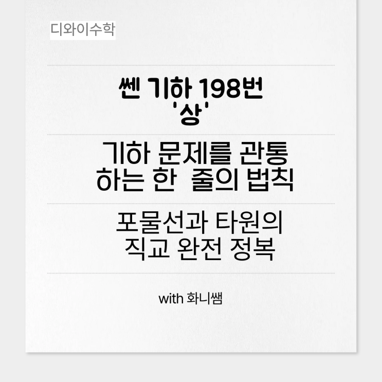 [기하] 포물선과 타원의 직교, '30초 컷' 공식의 비밀 안녕하세요!! 디와이 수학 '화니쌤'입니다. 오늘은 쎈 수학에서 198번 '상' 난이도 문제를 풀어볼까 합니다. 대부분의 학생들은 교점을 설정하고, 각각의 접선 방정식을 구해 기울기의 곱이 -1임을 증명하느라 많은 시간을 소비합니다. "공식은 유도하되, 결과는 무기가 된다" 위의 원리를 알고 있다면 이 문제는 더 이상 '상' 난이도가 아닙니다. 정답을 맞히는 공부를 넘어, '시간을 버는 공부'를 해야 합니다. 수학은 단순히 공식을 외우는 과목이 아닙니다. 왜 그런 결과가 나오는지 정확히 이해하고, 그 결론을 실전에서....... <img src="https://blogthumb.pstatic.net/MjAyNjAzMjJfMjk4/MDAxNzc0MTc1NTY1NjEy.jYP8xe2m0KmNUTEvB5MZcOxHPOxQZ7TcmUc8juSA9UYg.EPDUlDt-IJu8zsl15C-TNy7BKcW28V3FXcWGGPgJCsog.PNG/%B5%F0%BF%CD%C0%CC%BC%F6%C7%D0.png?type=s3" />