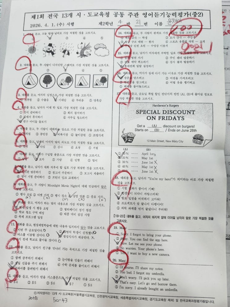 안녕하세요. Rachel입니다. 오늘은 전국중학영어듣기평가를 중2학생들이 치뤘어요. 조금은 어려웠다네요. 그래도 파써블 친구들 다들 잘했습니당^^ 다음자료는 EBS에서 받아서 올려보아요. 마음껏 쓰세용~ <img src="https://blogthumb.pstatic.net/MjAyNjA0MDFfMTMg/MDAxNzc1MDMxOTg3NTgz.yFP-RdZSWSKE_gDyjZ6-zChN-AqJEGdqkyTyoUD9UQMg.r3RQ_r9aYdiwNGPRNAhhjNaizEjXkjpDXH51jmPL0T0g.JPEG/%C0%B1%C3%A4%C0%CC.jpg?type=s3" />