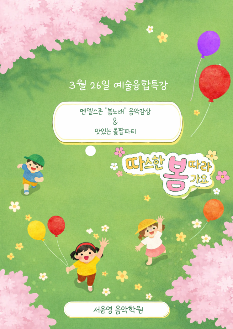 실력이 자라는 음악교육 서윤영 음악학원 입니다:) 이번 3월 예술융합특강으로는 봄 이라는 계절에 맞는 음악감상 수업을 준비해 보았어요 또한, 간식이 빠질수 없기에, 우리아이들이 요즘 제일 많이 사먹고 있는 콜팝 까지 준비해 보았습니다. 이번에 저희가 들을 곡은 멘델스존 “봄노래”인데요.. 멘델스존이 작곡한 무언가 중 다섯번째 곡이에요~! “무언가”는 가사가 없는 노래로, 그중 “봄노래”는 “봄”에 어울리는 오른손의 아름다운 선율이 도드라지는 곡이지요.. 다같이 한번 감상해 보실까요?? https://youtu.be/Nuq_gGVTg2I?si=MBXUDD_fCr9Tyrb_ 멘델스존에 대해서도 배우고, 듣기만 하면 재미없으니, 워크지로도 한번 더 복....... <img src="https://blogthumb.pstatic.net/MjAyNjAzMjdfOTQg/MDAxNzc0NjIwMTE5MTIy.VG9axaC7vLjyDnB_ri7aD6myLd5h9SB6unl8cmTHVH4g._24GE_BdzjGzwH1EA1gA7EZy3gNda6yCfSsaugyJGG0g.PNG/IMG%A3%DF3465.PNG?type=s3" />