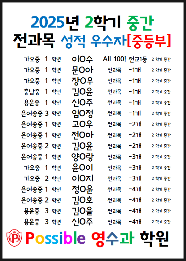 안녕하세요. Rachel 입니다. 이번에는 영어,수학,과학 뿐만이 아니라 전과목에서 우수한 성적을 보여준 멋진! 파써블 친구들을 자랑합니다. WoW!!!! 가오중1 이*수 학생은 전과목 All 백으로 전교1등을 차지했습니다!!! 멋져요!!! 아쉽게도 전과목에서 1개만 틀린 학생들도 5명이나 되고, 전과목에서 2개 틀린 학생은 3명, 전과목에서 3개 틀린 학생은 3명, 전과목에서 4개 틀린 학생은 4명으로 파써블 중등부에서 16명이나 전교 상위권을 차지하는 기록을 세웠습니다!!! 멋져요. 이뻐요. 사랑해요^^ <img src="https://blogthumb.pstatic.net/MjAyNTExMjdfMTc5/MDAxNzY0MjQwMzMwODUw.wd_aRynb2JiFuNlb0ljg3yrrS9MYL8x93_xjnBvsOVUg.KHnTtPlMl8M3F-x5Tin2SsooyEZ6dCapZwOVXsekFUIg.PNG/25._2%C7%D0%B1%E2_%C0%FC%B0%FA%B8%F1_%BC%BA%C0%FB%BF%EC%BC%F6_o%C3%B3%B8%AE.png?type=s3" />