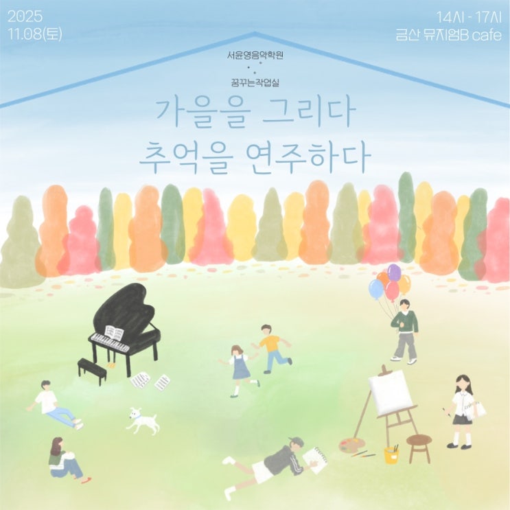 오늘의 기록 지난 11월 8일에는 저희 #서윤영음악학원에서 가을연주회 가 있었답니다 그 이야기 속으로 함께 가보실까요?? 지금 바로, 처음에 기획의도는 가을 버스킹이였어요. 작년봄에 저희가 진행했던 봄 버스킹도 살짝쿵 구경해보세요 https://m.blog.naver.com/chunsa9296/223454519173 허나, 가을에 저희 모차르트 콩쿨 본부2차아이들과 예선대회를 치르는 아이들 매주 있는 콩쿨 일정으로 좋은 가을날에 야외연주회는 무리라고 판단, 까페연주회로 변경했답니다^^ 하지만, 버스킹의 분위기를 버릴수 없다는 원장님의 굳은 결심 실내이지만 야외같은 분위기의 까페를 대전, 저희동네와 가까운 금산까지 싹다 찾....... <img src="https://blogthumb.pstatic.net/MjAyNTExMjdfMjk5/MDAxNzY0MjUzNzQxNDg1.7okDfHdS2E1IHxTgTb3-jC-qwSkvej-X-mtV0WR4Iisg.tN7wXLyxmI6nN2FxYpUeq0qEyE_F936A8vYSeZjkUXog.JPEG/IMG%A3%DF1289.JPG?type=s3" />