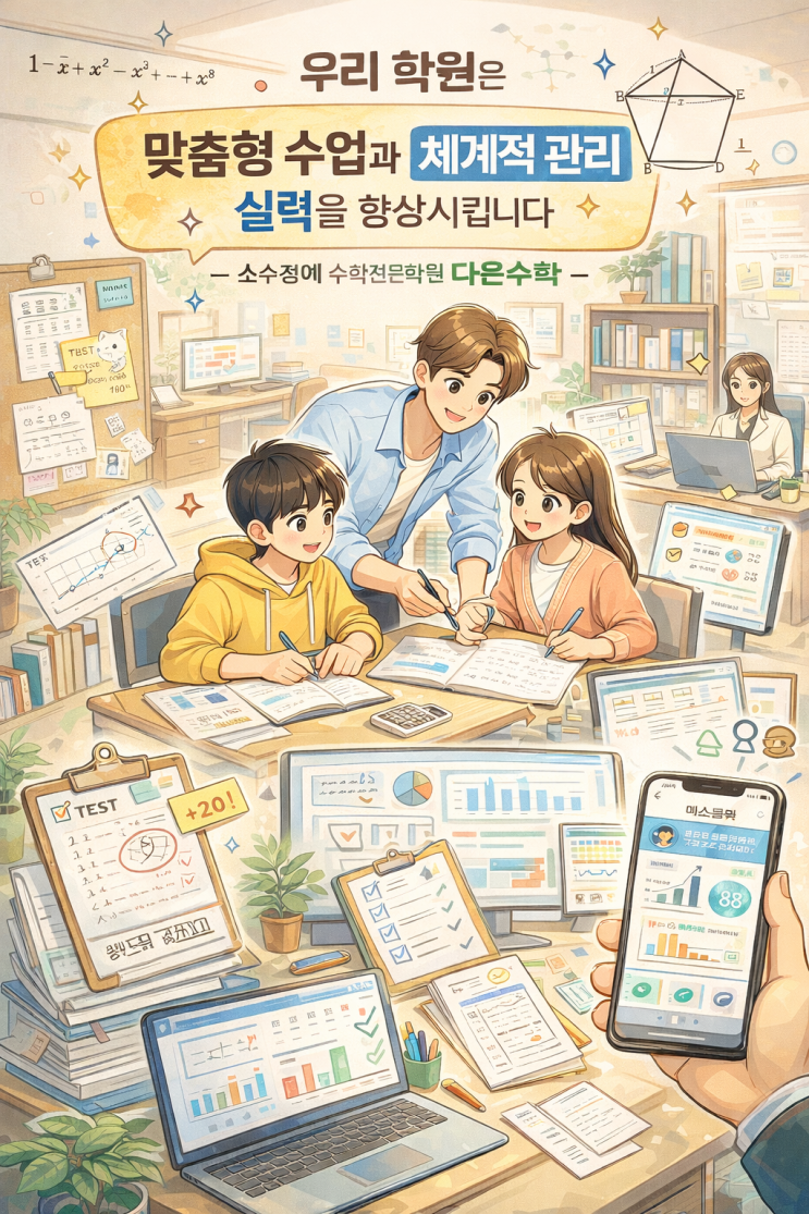 안녕하세요 대전 목동의 수학학원 다온수학입니다~ 오늘은 다온수학이 어떤 ‘시스템으로 운영되는 학원’인지, 그리고 그 시스템이 학생에게 어떤 도움이 되는지 차분히 설명해보려고 합니다. 1. 다온수학이 말하는 ‘맞춤형 수업’이란 다온수학에서 말하는 맞춤형 수업은 단순히 문제를 다르게 주는 수업이 아닙니다. 학생의 학년 현재 실력 학교 진도 다른 학원·일정까지 고려한 시간표 이 모든 것을 함께 보고 가장 효율적인 수업 환경을 만들어 주는 것이 다온수학의 맞춤형 수업입니다. 2. 수업 인원은 적게, 시간은 겹치지 않게 ✔ 한 수업의 최대 인원은 6명 ✔ 가능한 한 더 적은 인원 수업으로 배정 ✔ 다른 학원 시간과 겹치지 않도....... <img src="https://blogthumb.pstatic.net/MjAyNjAxMTVfMjM4/MDAxNzY4NDYzMzgxMDc1.miXgTNio67jSl7eFMC10QbEh0wIwmmDJK7dCQdTpP-Ag._IM9p-FYuGAyWTzDbWPtgOn-pvNGDx2l9CvGsXpl5uMg.PNG/ChatGPT_Image_2026%B3%E2_1%BF%F9_15%C0%CF_%BF%C0%C8%C4_04_49_27.png?type=s3" />