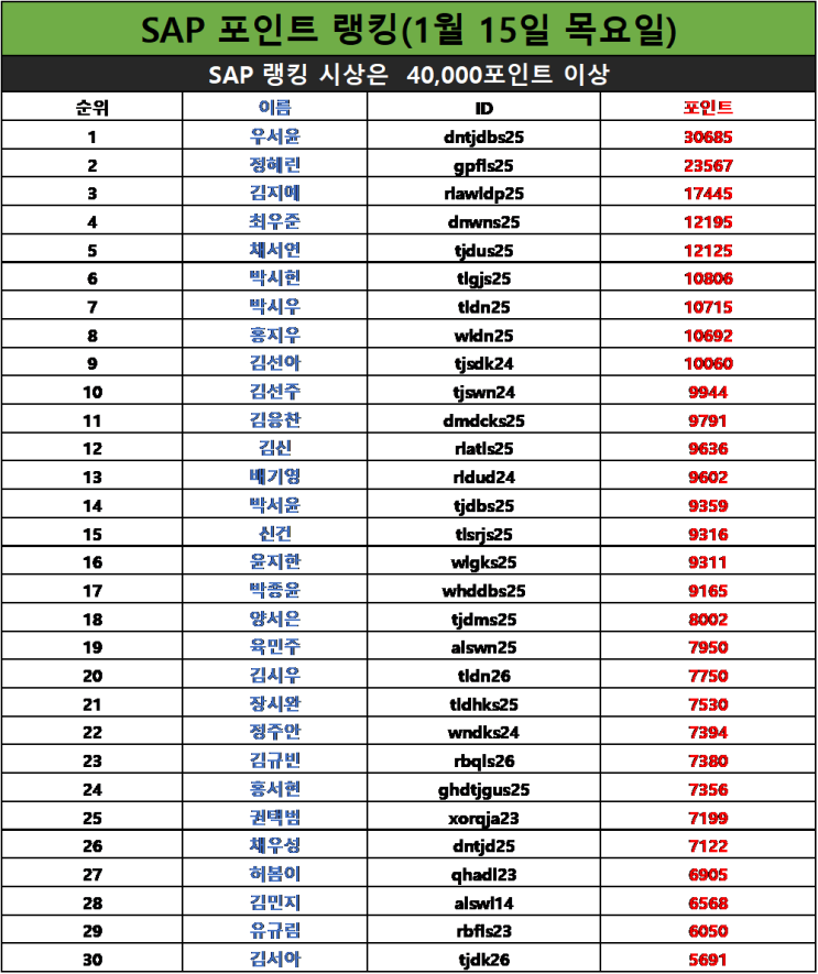 안녕하세요, 더클래스어학원입니다. 2025년 01월 15일 기준 SAP 포인트 랭킹 순위표입니다. <img src="https://blogthumb.pstatic.net/MjAyNjAxMTVfMjky/MDAxNzY4NDU4MjMwNzgz.jW9Tj7-jlZjOxdWGYZpYLcn5DF3msHpnTcrkPKgxMN8g.yirPMgkd8M8z9t8-Hc11MA7NkPyHF2m8hpAPvfFX7j8g.PNG/image.png?type=s3" />