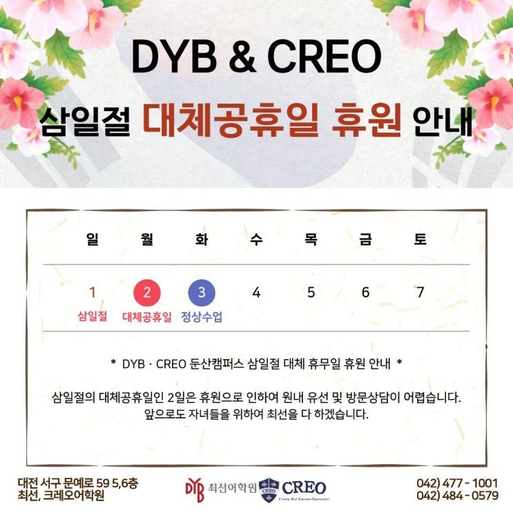 DYB & CREO 최선,크레오어학원 둔산캠퍼스 삼일절 대체휴무 안내