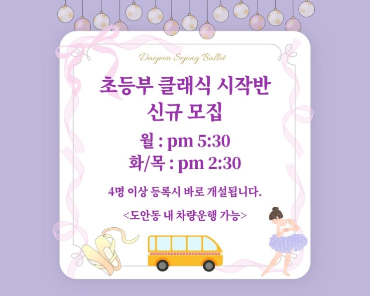 차량 안내 •모든 수업 차량운행 가능 (도안동 내 유치원 및 초등학교 픽업가능) 차량 정원탑승마감시 대기로 전환됩니다. 초등부 클래식 시작반 <신규 모집> •월요일 pm 5:30분 •화요일·목요일 pm 2:30분 •대상 : 8세~ 13세 •정원 : 소수정예 8명(4명 이상 등록시 바로 개설됩니다) 등록안내 - 주1회부터 등록가능 , 회차별 등록가능 - 대전세종발레학원의 발레수업 차별화 - •이보용원장님과 강사선생님 직강 • 체형 교정 & 바른 자세 형성 •음악성과 표현력을 길러주는 즐거운 수업 •집중력·자신감을 키우는 맞춤형 지도 학원 안내 •위치 : 대전 서구 동서대로696, Fm프라임2차 6층 •주차 : 지하주차장(무료....... <img src="https://blogthumb.pstatic.net/MjAyNjAzMDZfMTU4/MDAxNzcyNzYxNTU3MTI3.VO2BpEhQNSeB7vGvU-0XK0MeFWxkxfK1qHbMWutYhyMg.uqIsDy1vBvBGbKVD4syDgNdwMMILAEFp4DyO_esfUH0g.JPEG/900%A3%DF%C8%AD%A3%DF%B8%F1_%C3%CA%B5%EE%BA%CE_%BD%C3%C0%DB%B9%DD_%BD%C5%B1%D4%B8%F0%C1%FD.jpg?type=s3" />