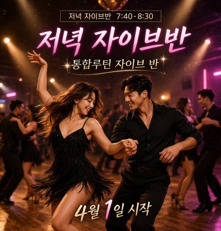 요즘 이런 생각 해보신 적 있으시죠? “나도 좀 제대로 춤 배워보고 싶다…” “운동도 되면서 재밌는 거 없을까?” 그 답이 바로 댄스스포츠 자이브(Jive) 입니다 월/수 저녁 7:40 - 8:30 4월 1일 START! 성인 단체반 자이브반 모집 이번 수업은 단순 취미반이 아닙니다. 자이브 통합루틴 (31번 ~ 60번) 진행 실제 춤을 “완성”하는 과정으로 진행됩니다 ✔ 이런 분들 무조건 오셔야 합니다 ✔ 춤 처음인데 제대로 배우고 싶은 분 ✔ 운동 + 스트레스 해소 동시에 하고 싶은 분 ✔ 몸치 탈출하고 자신감 얻고 싶은 분 ✔ 취미를 “진짜 취미답게” 만들고 싶은 분 자이브는 빠르고 경쾌한 리듬으로 ✔....... <img src="https://blogthumb.pstatic.net/MjAyNjAzMjNfMTc5/MDAxNzc0MjM5MTc3ODc0.cKrpo_3U7JrrBSVk_N_IAgaxknOiNp3ozPXVIPu2txwg.tZKqf9yMDWUj2dKGelOL-QuYRewwEnmTyZ0JpoKtnO0g.JPEG/F09DB7B1%A3%AD631F%A3%AD4A69%A3%ADA0C9%A3%AD998F0CEF0225.jpg?type=s3" />