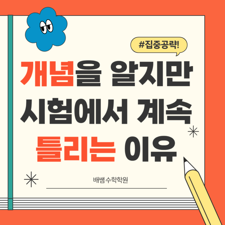 안녕하세요. 학생분들, 학부모님들! 관평동 배쌤수학학원입니다. 수학 공부를 하다 보면 “개념은 다 아는데 시험에서 자꾸 틀려요” 라는 이야기를 자주 듣게 됩니다. 분명 수업도 잘 이해했고, 문제 풀이도 따라갈 수 있는데 시험 점수는 기대만큼 나오지 않는 경우입니다. 이러한 상황은 단순한 실수 문제가 아니라 공부 방식에서의 차이에서 비롯되는 경우가 많습니다. 오늘은 개념은 알고 있지만 시험에서 틀리는 이유에 대해 정리해 보겠습니다. 1. ‘이해’와 ‘풀이 능력’을 구분하지 못하는 경우 수업을 듣거나 해설을 보면 이해한 것처럼 느껴질 수 있습니다. 하지만 시험에서는 누구의 도움도 없이 스스로 문제를 해결해야 합니다. 이....... <img src="https://blogthumb.pstatic.net/MjAyNjAzMjRfMjIg/MDAxNzc0MzM2NTYxNjAz.waW6n0zb3CiL95oWswbNVu7TUmzCTGV0QqXrDxHFS6sg.FHhX7yge-Qiz5a88_iypyeBmd-n93ya08URXJTgugu0g.PNG/%C1%A6%B8%F1%C0%BB_%C0%D4%B7%C2%C7%D8%C1%D6%BC%BC%BF%E4_-001_%281%29.png?type=s3" />