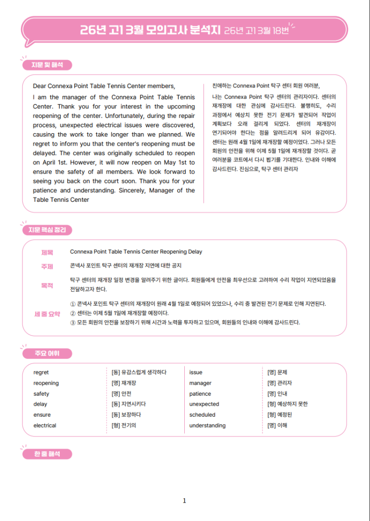 [무료 다운로드] 2026년 고1 3월 모의고사 영어 분석지 [좌지문 우해석 / 구문분석 / 한줄해석 / 끊어 읽기 / 문장테스트] 분석지 변형문제 프로그램 지인에듀