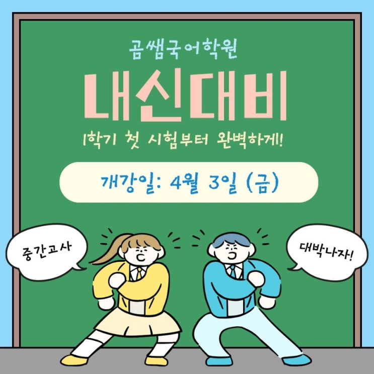 안녕하세요, 곰쌤국어학원입니다! 따스한 봄바람과 함께 새 학기가 시작된 지 엊그제 같은데, 벌써 1학기 첫 시험(중간고사) 기간이 다가오고 있습니다. 중학교에 진학하여 국어가 어려워서 국어 기초 체력을 키워야하는 중 1 학생들! 고입을 앞두고 내신 관리에 박차를 가해야 하는 중2, 3 학생들!! 모두에게 중요한 이번 시험, 어떻게 준비하고 계신가요? 곰쌤국어학원에서는 우리 학생들이 이번 1학기 첫 시험부터 흔들림 없이 탄탄한 실력을 발휘할 수 있도록 [1학기 내신 대비 ]를 시작합니다! 이번 시험에서 완벽한 결과를 내기 위해, 곰쌤국어학원은 우리 지역 주요 중학교들의 시험 일정을 면밀히 파악하고 철저한 전략을 수립했습니다. ....... <img src="https://blogthumb.pstatic.net/MjAyNjAzMjdfMjA5/MDAxNzc0NTk0NjQwMTM2.iRYTcUT6C46s7nc8sUr2x5t7_arMfT82v122qqYIM5sg.W-0rDnnwt4BnpHXHRTqbFjVHYDh5R2DDTwU8DdLxduAg.JPEG/900%A3%DF1774592545998.jpg?type=s3" />
