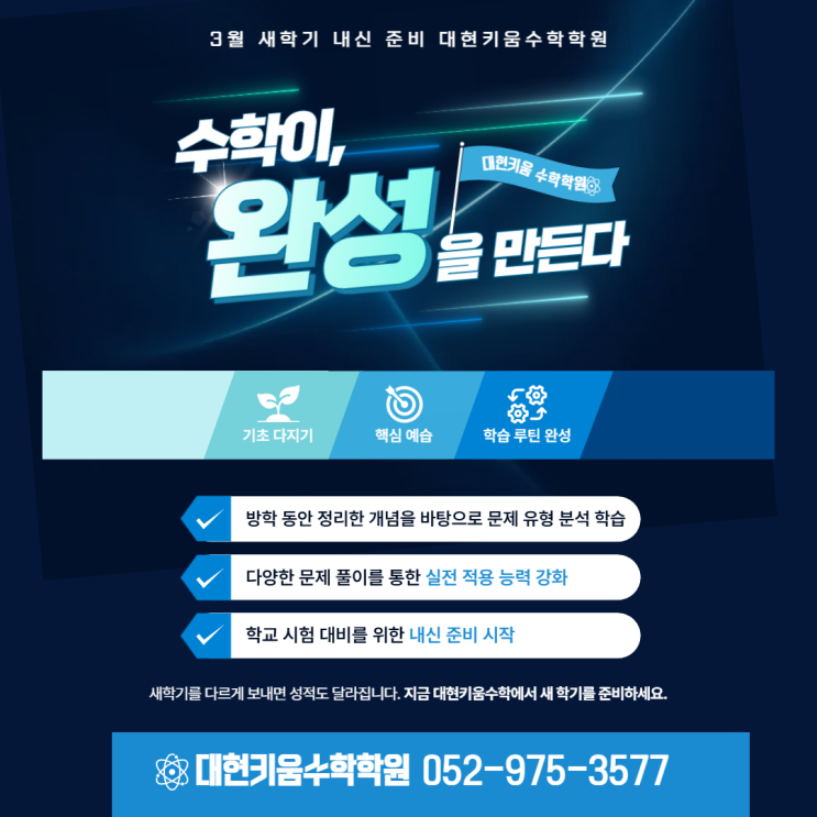 안녕하세요 울산 남구 야음동 초등 · 중등 · 고등 수학 전문 대현키움수학학원입니다. 겨울방학 동안 학생들은 새학기를 준비하는 시간을 가졌습니다. 개념을 정리하고 선행 학습을 통해 기본기를 다지며 새 학년을 위한 준비를 차근차근 마쳤습니다. 그리고 3월이 시작되면서 학습의 방향이 달라집니다. 이제는 단순한 개념 학습을 넘어 문제 유형 분석과 풀이 중심 학습, 그리고 학교 내신 대비 학습이 본격적으로 시작되는 시기입니다. ✏️ 3월부터 시작되는 학습 방향 ✔ 방학 동안 정리한 개념을 바탕으로 문제 유형 분석 학습 ✔ 다양한 문제 풀이를 통한 실전 적용 능력 강화 ✔ 학교 시험 대비를 위한 내신 준비 시작 대....... <img src="https://blogthumb.pstatic.net/MjAyNjAzMTZfMjU4/MDAxNzczNjI0NDAxMzM4.flc_GUSOByQKQkllKFiyepkMXXh7u7QimJNHmXocnt8g.CrnTcbDGmTRsBiEeqe7f1ZiAdzTr8YYHa2KwzkC4b6sg.PNG/%BC%D2%BF%B5_%C5%DB%C7%C3%B8%B4_2-012_%284%29.png?type=s3" />