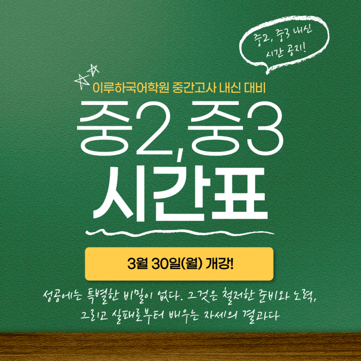 안녕하세요, 국어교육의 좋은 동반자 이루하국어학원입니다. 새 학기의 설렘이 가득했던 3월도 어느덧 중순을 지나, 올해의 첫 시험인 '중간고사'가 훌쩍 다가왔습니다. 첫 시험이라는 부담감에 긴장하고 있을 우리 학생들을 위해, 이루하국어학원에서 체계적이고 든든한 중2, 중3 내신 대비반을 준비했습니다. 성공에는 특별한 비밀이 없습니다. 철저한 준비와 노력, 그리고 실패로부터 배우는 자세만이 완벽한 결과를 만들어냅니다. 이루하가 그 땀방울의 과정에 함께하겠습니다. 이루하국어학원 중간고사 내신 대비반 개강 안내 개강일: 2026년 3월 30일 월요일 대상: 중학교 2학년, 3학년 중학교 2학년 시간표 "지....... <img src="https://blogthumb.pstatic.net/MjAyNjAzMTdfMTYx/MDAxNzczNzUyMTk0Nzgw.T8vEgZCfPyZRXiSeH_hRaSha40tAHBWVB1HUGeL1FWcg.YLsECpV2PNbriNoBesnKrYyVK4eS4DEfwpj0JxdvdhQg.PNG/1.png?type=s3" />