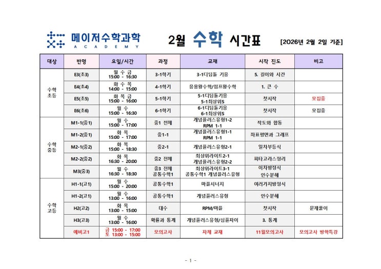 2026년 2월 수학/과학 수업 시간표 입니다^^ 자세한 수업 문의는 학원으로 연락주세요. 044-862-5823 <img src="https://blogthumb.pstatic.net/MjAyNjAxMzFfMyAg/MDAxNzY5ODU3MDk4MjUy.tYkoQPm5idkWEa6G_CH0AWvH5w1_VChQtxKNxt66dSYg.BThXp68PefsYR9Ep9kNKYFmb3V21T4KWB0WuHfRBe_og.JPEG/2%BF%F9_%BC%F6%BE%F7_%BD%C3%B0%A3%C7%A5001.jpg?type=s3" />
