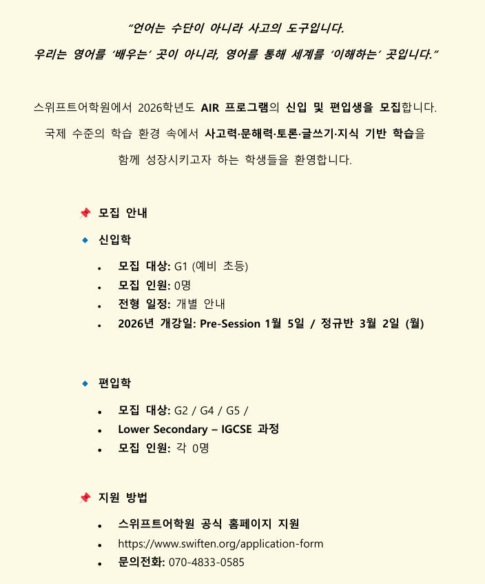 2026 스위프트어학원 AIR 프로그램 신입·편입생 모집 안내