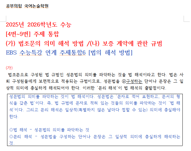 2025년 2026학년도 수능 [4번~9번] 주제 통합 (가) 법조문의 의미 해석 방법 / (나) 보증 계약에 관한 규범 EBS 수능특강 연계 - 주제통합6 [법의 해석 방법] (가) 법조문으로 구성된 법 규범인 성문법의 의미를 파악하는 것을 법 해석이라고 한다. 법은 사회 구성원들에게 보편적으로 적용되는 규범이므로, 성문법을 ⓐ구성하는 단어나 문장은 그 일상적 의미에 충실하게 해석되어야 한다. 이러한 ‘문리 해석’이 법 해석의 출발점이다. 그러나 문리 해석으로 그 내용을 제대로 파악하기 어려우면, 그것이 사용된 맥락을 ⓑ고려하여 그 의미를 파악하는 ‘체계적 해석’, 입법 과정에서 논의된 내용을 바탕으로 그 의미를 파악 하는 ‘역사적 해....... <img src="https://blogthumb.pstatic.net/MjAyNTEyMDlfMTUz/MDAxNzY1Mjc3OTc3NTUw.v-NfvfOnHitzM1ZjdsA_UUb36VedBUXcaFnZDyTy0Vkg.HGKEx2BONoFmSvmaFgNzwwQQbi6CQAz3sry34xHjdwAg.PNG/111.PNG?type=s3" />
