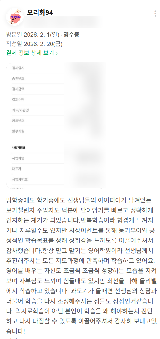 안녕하세요. 올리벨 영어입니다. 2월에도 정성 가득한 네이버 리뷰를 남겨주신 학부모님들께 진심으로 감사드립니다. 이달의 리뷰 키워드 학생 관리가 철저해요 맞춤 지도 체계적인 수업 상담·피드백 동기부여 [2월 베스트 리뷰 : 모리화94 님] 이번 달 베스트 리뷰는 모리화94 님의 리뷰로 선정했습니다. 방학 중에도, 학기 중에도 꾸준히 이어지는 올리벨의 수업 흐름 속에서 보카 챌린지로 단어 암기를 ‘억지’가 아니라 ‘성취 경험’으로 바꿔준 점, 그리고 아이가 힘들 때도 “왜 해야 하는지”를 다시 세우도록 돕는 상담과 조정의 과정까지 리얼하게 담아주셔서 더 마음에 남았습니다. 특히 “과도기가 올 때 상담을 통해 학습을 다시 조....... <img src="https://blogthumb.pstatic.net/MjAyNjAzMDhfOTAg/MDAxNzcyOTQ2NDgzMTM1.vjbVE8xhJXqt23chhI4vl21wzT0QObqvBBAGOlGjLOgg.5VWgpO8fz5B1J4x6Zkv1U9GPlQtkmv5VP5Yvdx9K-ggg.PNG/image.png?type=s3" />