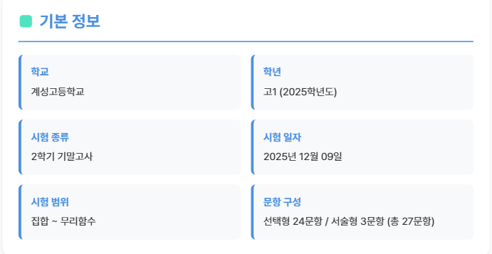 안녕하세요. 오늘은 계성고 1학년 학생들과 학부모님들께 도움이 될 만한 자료로, 2025학년도 계성고 고1 1학기 기말고사 수학 기출문제 분석 내용을 정리해 보았습니다. 이번 분석에서는 시험의 전반적인 난이도와 출제 흐름을 살펴보고, 실제 시험 대비 과정에서 어떤 점에 초점을 두고 공부해야 하는지를 중심으로 정리했습니다. 2025년 1학기 기말고사는 계성고 기존 시험의 방향성을 유지하면서도, 교육과정의 취지에 맞게 개념 이해도와 기본기, 문제 유형에 대한 적응력을 고르게 확인하는 형태로 출제되었습니다. 그로 인해 단순한 공식 암기보다는, 개념을 정확히 이해하고 적용할 수 있는지가 성적을 가르는 핵심 요소로 작용했습니다....... <img src="https://blogthumb.pstatic.net/MjAyNTEyMDlfMTEg/MDAxNzY1MjYxODk0NjAz.XrdyxcXoKp6RyONuM-vbe_F-9dhnsWXbtxBrZmmutpkg.gPoFEzIkUUyGyTsxrbuoU7JXnFtXJAIC4gPutiLk-BEg.PNG/image.png?type=s3" />