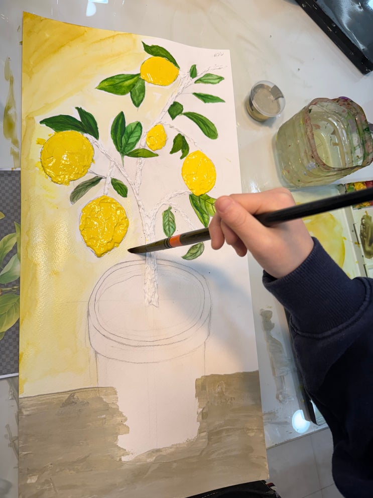 안녕하세요. 위례미술학원 아트다입니다. 오늘은 향긋한 봄의 향기가 물씬 나는 수업, 레몬트리를 소개할게요. 아이들과 함께 싱그러운 레몬나무가 담긴 화분을 그려보았습니다. 레몬트리 화분을 그리며 다양한 기초 드로잉과 표현 방법을 배워보았어요. 먼저 화분을 그리며 원기둥 형태를 이해하고, 나뭇가지를 자연스럽게 뻗어 나가도록 표현해 보았습니다. 또한 레몬을 그리며 구의 형태를 응용해 입체감을 살리고, 배경과 잎의 색을 섞어가며 색의 혼합도 경험해 보았답니다. 수업이 지루하지 않도록 다양한 재료도 사용해 보았어요. 모델링 페이스트, 젯소, 겔 미디움, 핸디코트, 황토 핸디코트 등을 활용해 밀어서 색칠하기....... <img src="https://blogthumb.pstatic.net/MjAyNjAzMTNfMjYx/MDAxNzczMzk3MTg1MDAy.17ICCHnJbECrV0SMFofPKacK340yuynzQ9u7CuhnDJIg.FLwDpxIAAcOycHKiUFdoqrvWk4k6rh5O3jkAjT1K234g.JPEG/IMG_4752.jpeg?type=s3" />