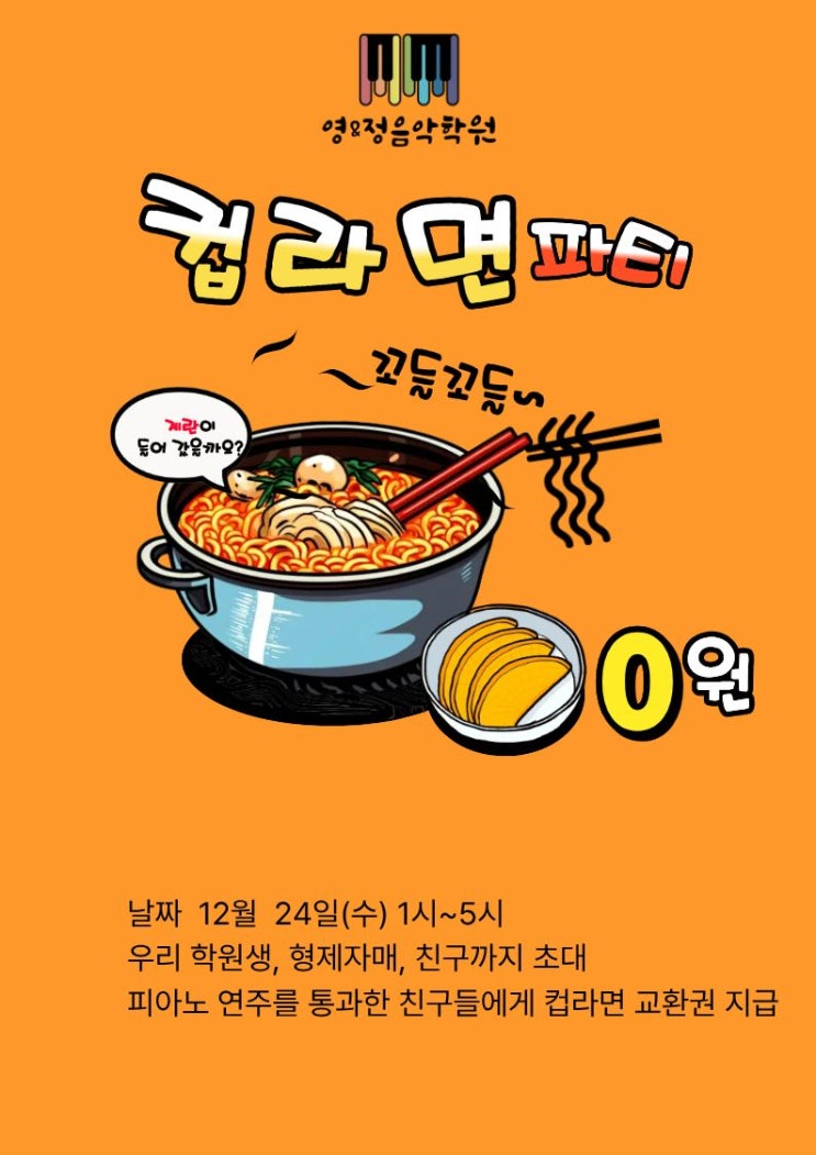 성탄이브 12월 24일에 컵라면 파티해요^^ 시간은 1시~5시 친구 1명 초대가능해요. 우리끼리 음악회도 있으니 기대해주세요~~♡♡ #영앤정피아노 #야탑초차량운행 #중탑초 #영앤정음악학원 #상희공원버스킹 #야탑초차량운행 #야탑청소년수련관 <img src="https://blogthumb.pstatic.net/MjAyNTEyMjNfMjg4/MDAxNzY2NDU2MDAyOTI3.pMx5mbhd-m1u6hwqj0ygCKJtr8nTY0_pc_Ul6mq7GBIg.jminIqsk4SQPKOOIucT2203HYUEbymd32d3VZhVC5WAg.JPEG/1765765482846.jpg?type=s3" />