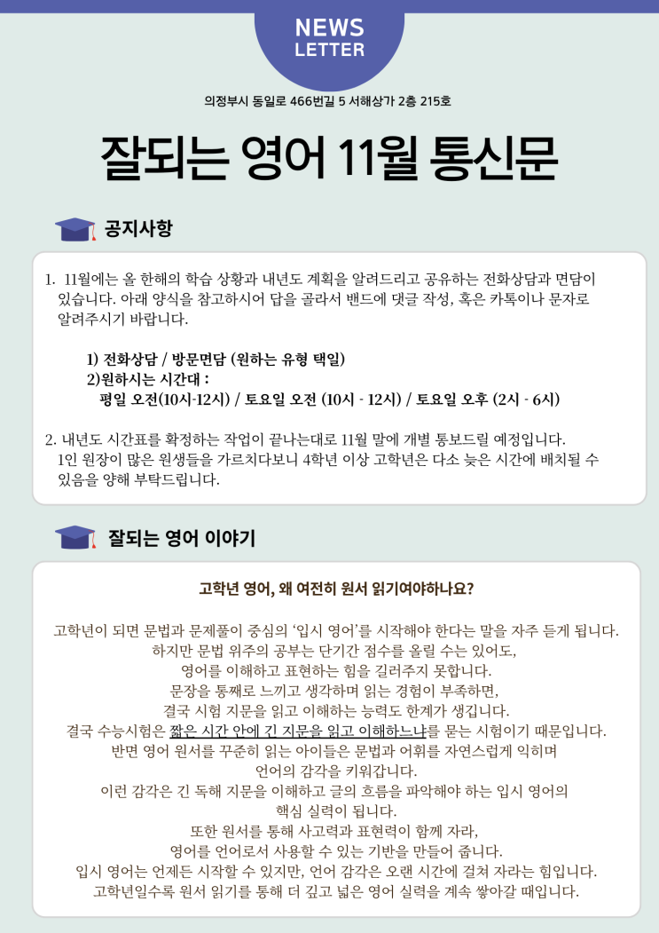 아이들이 가장 행복하게 영어를 배우는 방법이 원서리딩인데 해가 갈수록 원서 하는 곳은 찾아보기가 힘든 이 한국의 교육현실이 안타깝습니다. 저는 계속 아이들과 원서로 행복한 영어 공부를 하는 것이 사명입니다. 가장 인기 많은 기초파닉스반은 2027년도까지 대기 마감이라 내년도 신입생은 받지 못함을 양해바랍니다. #발곡초영어 #의정부초등전문영어 #의정부원서리딩 #청룡초영어 #장암초영어 #의정부초등영어교습소 #의정부영어교습소 #신곡동영어학원 #신곡동초등영어 #신곡동원서리딩 <img src="https://blogthumb.pstatic.net/MjAyNTExMTBfMjEz/MDAxNzYyNzg2NjcxMzc4.exW88q3UtGtgws5BeyytAlaQPBvRI9h_IG28r18ifrQg.YWr0xIipFnrWTuZ5FuS9qdfTZqFvpb0p_UrPra93oz8g.PNG/2025-11.png?type=s3" />