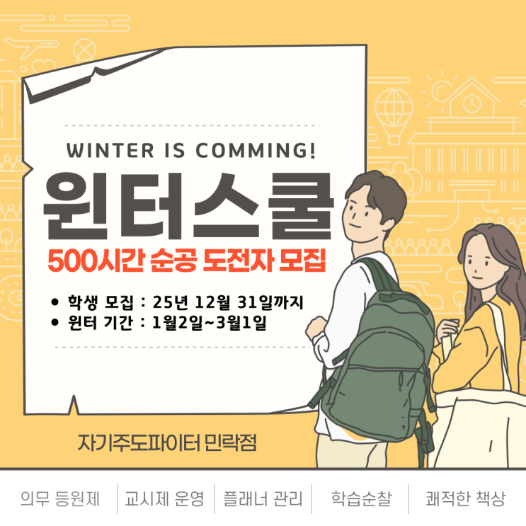 겨울방학 윈터스쿨 · 학생모집 기간 : 2025년12월31일(수) 까지 · 윈터 시즌 기간 : 1월2일(금) ~ 3월1일(일) 학생 스스로가 작성한 스케줄표 기반 관리 : 본인 스케줄에 맞춘 스케줄표를 작성, 제출하여 책임감 있게 지키며 자기주도 학습하는 형태. : 1교시(8:40) 지각시, [스터디 베이스]에서 학습 후 1교시가 끝난 시점에(10:00) 본인 좌석으로 돌아갈 수 있음. 지각 · 결석 · 외출 : 사유서의 내용은 작성된 그대로 학부모께 안내 전송됨. : 결석은 전송되지 않음. 식사 & 식사시간 점심시간 11:40 ~ 13:00 저녁시간 17:40 ~ 19:00 *도시락 제휴업체 계약중단으로 인하여 식권판매는 더이상 하지 않습니다.(25년 10월~) *냉장고 사용시....... <img src="https://blogthumb.pstatic.net/MjAyNTExMjhfNjcg/MDAxNzY0MzExNzkyODI4.0wY00KbJ1L0oQd81D4AeZvHHuoVytod0djV7JeB2WVsg.DHn9Xl39CJbW66JIkIAiUyJUAkEAUjKyRNnVOfoLLl0g.PNG/001.png?type=s3" />