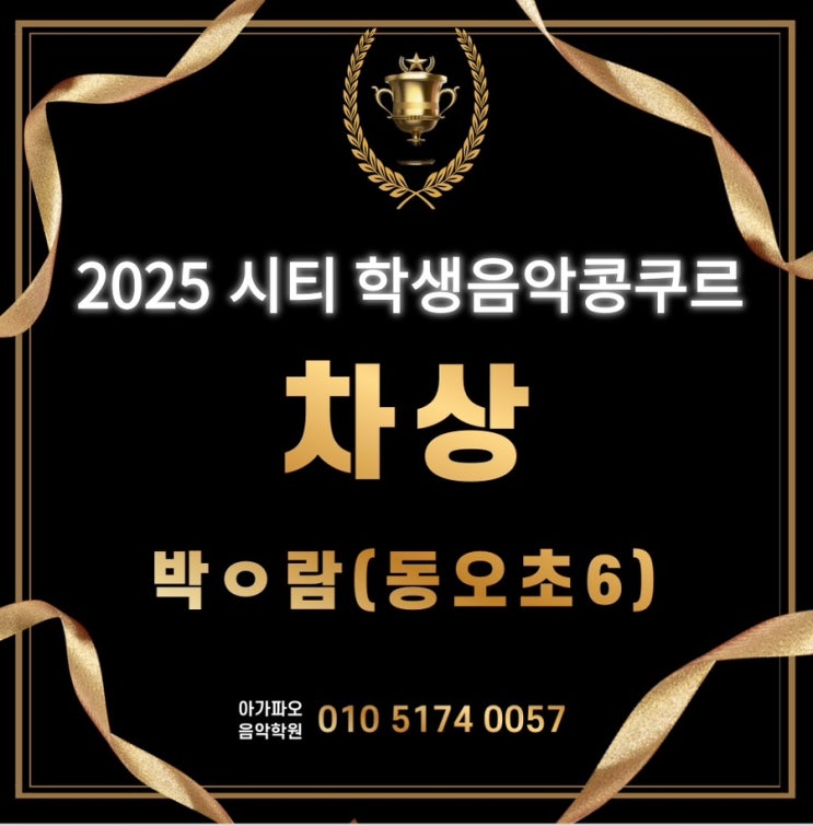 안녕하세요 아가파오 음악학원입니다. 오늘은 너무너무 기쁜 소식을 전하게 되었어요! 바로, 동오초 6학년 박ㅇ람 학생이 2025 시티 음악학생콩쿠르에서 차상(3등)을 수상했습니다 처음 도전한 콩쿨..! 사실 올해는 콩쿨 계획이 없었어요. 하지만 예람이는 중학교 진학을 앞두고 있었고, 그동안 꾸준하게 쌓아온 연습과 표현력이 있어서 “지금이라면 도전해볼 수 있겠다!” 싶어 한 번 지원해 보았습니다. 첫 콩쿨이라 긴장도 많았을 텐데 정말 담대하고 집중력 있게 무대를 완주했고 그 결과 이렇게 뜻깊은 상을 받게 되었어요 전문 심사평도 공유합니다 “날렵하고 화려한 소리로 곡의 분위기를 음악적으로....... <img src="https://blogthumb.pstatic.net/MjAyNTEyMDdfODAg/MDAxNzY1MDY4MzIwMzAy.9hvhjZHacrNwgVmqZjGn8ef7VH6SracXEaUFLVDUlEcg.7NhF2sq3Xiq_nlh6DJt7_ap7Uj56-EunKNch35Hppdgg.JPEG/IMG%A3%DF5878.jpg?type=s3" />