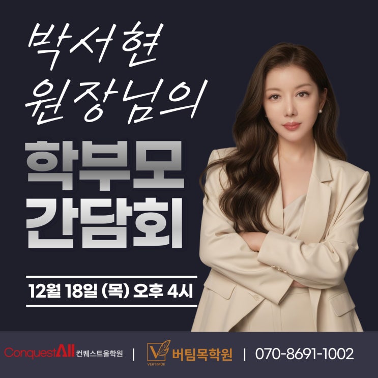 안녕하세요! 입시총괄센터 컨퀘스트올학원 센터장입니다 민락동 학부모님들이 기다리던 박서현 원장님 직강 간담회가 열립니다! ✔ 일시: 12/18(목) 오후 4시 ✔ 장소: 컨퀘스트올학원 ✔ 사전예약 필수 (070-8691-1002) ✔ 선착순 마감 중! 예약 안내 070-8691-1002 / 010-5846-7100 https://forms.gle/s1zsxMztVZr7eDeC9 “대치 학습 전략, 이제 민락동에서 그대로 들으세요.” 버팀목학원은 대치동 출신 박서현 원장님의 데이터 기반·맞춤형 학습 로드맵으로 민락동 대표 입시 학원으로 성장했습니다. 원장님은 민락 학생들의 학습 약점 대입 전략 포인트 과목 간 시너지 구조 이 세 가지를 누구보다 정확....... <img src="https://blogthumb.pstatic.net/MjAyNTEyMDhfMTk2/MDAxNzY1MTkxMjM5Mzk2.Cz8DJQ5K8PHi4kq2V7fihJqy9mZNDrGZeJwACIF-eRkg.UxpmjDhTaBRLcc4Mste0e8Z2rgd_R-HLW_0VmvQjyiQg.JPEG/%C4%C1%BF%C3-%BA%ED%B7%CE%B1%D7_%C0%CE%BD%BA%C5%B8-002_%2820%29.jpg?type=s3" />