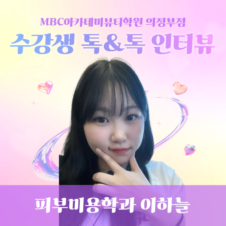 안녕하세요~ 의정부미용학원 MBC아카데미뷰티학원 의정부점입니다. ^^ 다들 새해복 많이 받으시고 행복한 2026년이 되시길 바랄게요! 오늘은 수강생 톡톡인터뷰를 준비해왔습니다~ #의정부미용학원 #동두천미용학원 #노원미용학원 #양주미용학원 #포천미용학원 오늘의 주인공! 바로 만나러 가볼까요~?^^ 오늘의 인터뷰 주인공은 최근 피부국가자격증을 원패스로 취득한 MBC 의정부미용학원 이하늘 학생입니다~ 의정부미용학원 MBC아카데미뷰티학원 의정부점 후기 이하늘 학생이 수많은 의정부미용학원 중에서 MBC아카데미뷰티학원을 선택한 이유는 가까운 위치 때문이었다고 하네요~ 의정부역과 경전철의정부역 바로 앞에 있어서 위치적으로 정말....... <img src="https://blogthumb.pstatic.net/MjAyNjAxMDZfMTIx/MDAxNzY3NjgyMjEzOTQ2.R9Rb8QyNBvU9RglISm0hBpk19gn9iFC805VWS4-7DFAg.8fOouZ555STienq-GSHjmVtYe94mgP3mtyVpW4LE6Gog.PNG/%C0%C7%C1%A4%BA%CE%B9%CC%BF%EB%C7%D0%BF%F8_%BC%F6%B0%AD%BB%FD%C0%CE%C5%CD%BA%E4_%282%29.png?type=s3" />