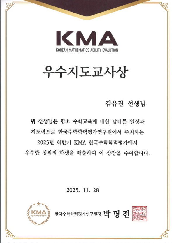 안녕하세요 내일은 우리가 피어날 차례, 피어날 학원 입니다! 2026년 새해가 밝았습니다. 새해 첫 글은 작년 하반기 수상 소식을 전해보려고 합니다. 피어날 학원에서는 상반기, 하반기 초등대상으로 경시대회를 나가고 있습니다. 작년 하반기에는 6학년은 KMA를, 6학년을 제외한 학년은 HME를 나갔습니다. 나간 학생들 모두 입상을 하는 쾌거를 이루었습니다. KMA는 초등1~2학년은 25문항, 초3~중3으로 30문항으로 출제 되며 90점 이상 금상, 80점 이상 은상, 70점 이상 동상, 50점이상 장려상이 수여됩니다. 그 중 상위 10% 이내 학생을 지도한 선생님에게 우수지도교사상을 수여합니다. 두명의 학생이 상위 10%이내에 들어 우수지도교사상을 받....... <img src="https://blogthumb.pstatic.net/MjAyNjAxMDdfNTgg/MDAxNzY3Nzc2NzgyODEz.C_2PribbHBHLkyPiRA2dNQUoUR2nT5t2RbqqTaZAQtcg.u4Fz-LJSQxP-pnpNL0ww-lkz01jzJdtlPxthWC9RlEAg.JPEG/20260107174914.jpg?type=s3" />