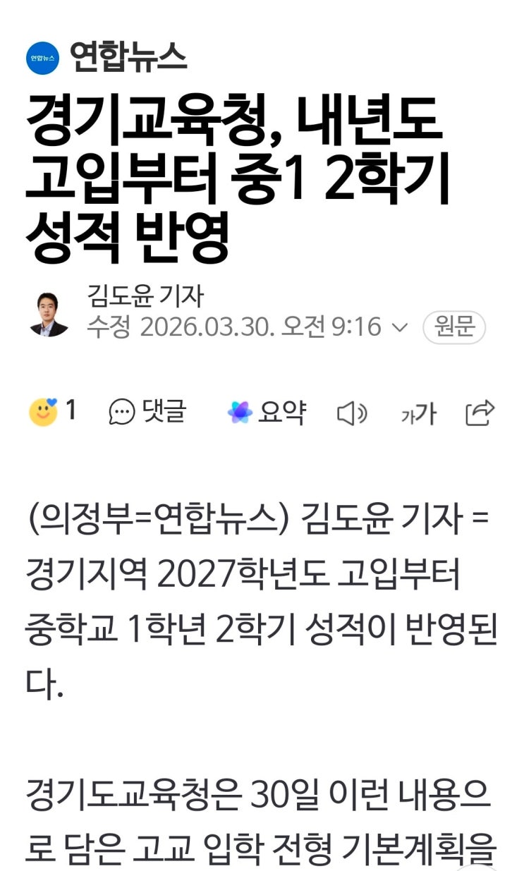 안녕하세요, MJ the ENGLISH 입니다. **경기도 지역에만 해당되는 내용입니다.** 경기교육청에서는 현재 중2학년부터 고입지원시 중학교 1학년 2학기 성적부터 5개학기 성적이 반영된다고 합니다. 2027학년 (현 중2부터 반영) 2027학년도 고입 반영 내신 반영 학년 변경 중 1 2학기 - 중3 2학기 중1 1학기 자유학기 반영 ✘ 중1 2학기 반영 ✔︎ 중2 1*2학기 반영✔︎ 중3 1*2학기 반영✔︎ 총 5개 학기 반영 *경기도교육청 고시등록부에서 내용 확인 가능합니다* https://www.goe.go.kr/goe/na/ntt/selectNttList.do?mi=10962&bbsId=2425 <img src="https://blogthumb.pstatic.net/MjAyNjAzMzBfNzkg/MDAxNzc0ODQ0MTAzMDY0.cs69fXKHtdxoCkg_mzJQHWLS69l70Jr7d05rm4PHmqMg.V48EUX55KOnoqX40jGWNV3H5w4se7P99ClKIPrdUIiYg.JPEG/IMG_5478.JPG?type=s3" />