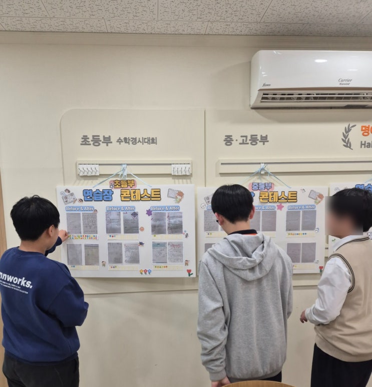 안녕하세요, 용죽 수담수학입니다. "수학은 결국 손으로 푸는 학문이다." 수담의 아이들은 이 말을 증명하기 위해 지난 한 달간 지독하게 연습장과 씨름했습니다. 단순히 글씨를 예쁘게 쓰는 대회가 아닙니다. 논리의 흐름을 잡고, 실수를 스스로 잡아내는 과정을 평가했습니다. 그 영광의 우승자들을 공개합니다! [초등부 우승자] : 현O연 학생 "식 없는 정답은 없다!" Before: 여기저기 흩뿌려진 계산식. After: 수담만의 '줄 맞춤 풀이' 완벽 적응! 이제는 서술형 문제도 거침없이 논리적으로 완주합니다. [중등부 우승자] : 이O온 학생 "오답의 이유를 스스로 추적하다" Before: 여기저기....... <img src="https://blogthumb.pstatic.net/MjAyNjAzMjdfMjI2/MDAxNzc0NTg1Mjc1NTQy.UgmU6uiOLitP8LhWuCUTJvPg0UQ8eGjMzprFpKtoaB8g.5zx6rztu584LN4Zs8CcZnu1QBVl-QyQO0OY-AI4T8wIg.JPEG/KakaoTalk_Photo_2026-03-27-13-19-51_003.jpeg?type=s3" />