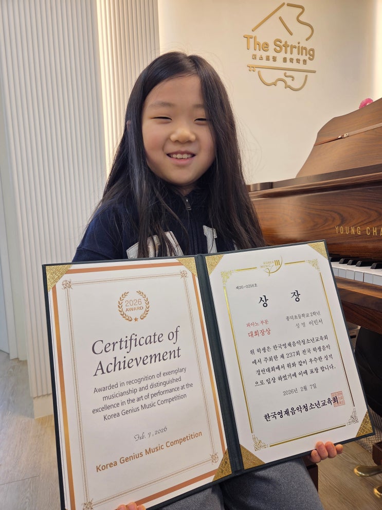 안녕하세요? 더 스트링입니다 :) 2월에 콩쿠르 참가한 친구들의 상장이 도착했어요! 친구들 앞에서 시상하고 많은 축하를 받은 시간이었어요! 다음 콩쿠르에 또 나가겠다는 친구들 :) 앞으로도 즐거운 성장이 되길 늘 응원합니다! <img src="https://blogthumb.pstatic.net/MjAyNjAzMDVfMTk1/MDAxNzcyNzA1MjQxNTI0.Ua_XmRo9EksQtelLDTVC1-tGUZr-lY4n2qNvO3jcAJMg.Hl1b9DFaELZLqU7ps2MvHUD2gO97lPNNa_W2ymOMY7Mg.JPEG/20260305_144829.jpg?type=s3" />