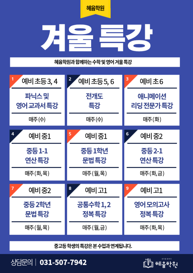 안녕하세요, 혜윰학원입니다 :) 혹시 알고 계신가요? 이호초 방학식이 벌써 한 달도 안 남았다는 사실! 그리고 더 놀라운 건… 이번 겨울방학이 무려 75일, 2달 반이 넘는 긴 방학이라는 점이에요. 길어진 겨울방학에 열심히 공부할 수 있도록 혜윰학원은 학년별로 꼭 필요한 9개의 핵심 특강을 준비했습니다! 공부는 초반에 어떻게 시작하느냐가 결과를 결정하니까요 :) 이번 겨울, 혜움학원의 9개 특강 한눈에 보기 ① 예비 초3·초4 파닉스 + 영어 교과서 특강 (매주 수) 기초 파닉스부터 교과서 예습까지 한 번에! 영어의 ‘기본기’를 만드는 황금 타이밍입니다. ② 예비 초5·초6 전개도 특강 (매주 수) 아이들이 직접 조립하....... <img src="https://blogthumb.pstatic.net/MjAyNTExMjdfMTQw/MDAxNzY0MjUxMjkwNjc1.PL_W3YWARuBWMcHeL3_X5teQu3bGUFjMaeCl9njM9mcg.BKFqwL91Pm1R-KpYVb4qnu-HmK6oa3PsShOoFB4WVvkg.PNG/%C1%A6%B8%F1%C0%BB_%C0%D4%B7%C2%C7%D8%C1%D6%BC%BC%BF%E4._%282%29.png?type=s3" />